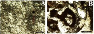 Figure 14. Thin section of Maria Farinha Formation limestone at Tambaba Beach. A) Matrix originally micritic and recrystallized by spastic calcite. Detail for transversal section of tube produced by vermiform organism, with agglutination of crystals on the wall (red arrow). Parallel nichols. Photo: Correia Filho (2014, p. 48); B) In the central portion of the photo, a gastropod fragment. Crossed nichols. Photo: Correia Filho (2014, p. 51).