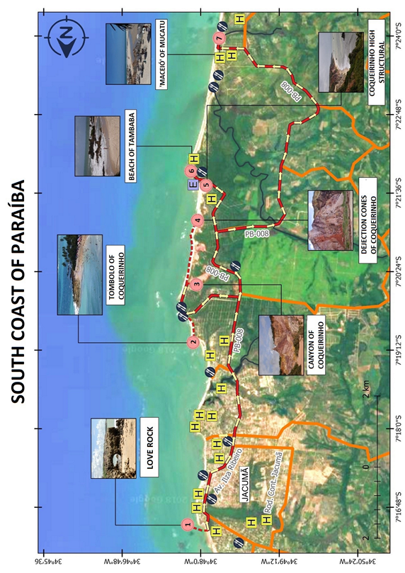 The objective of this work is to propose an itinerary in the southern coast of the Paraiba State. The itinerary includes seven places of geotouristic interest, being two important elements of geodiversity (geological/geomorphological feature of Amor Rock and geomorphological/hydrological feature of ‘Maceió’ of Mucatu) and five geological and geomorphological elements of geoheritage (Tombolo of Coqueirinho, Canyon of Coqueirinho, Cones of Dejection of Coqueirinho, Coqueirinho Structural High and Tambaba Beach). The aim of this proposal is to disseminate the physical aspects of the landscape (geology, geomorphology and hydrology) and the historical-cultural aspects of the assets, in order to contribute for their maintenance and conservation.