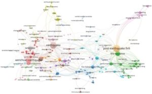 Keywords were selected in the form of commonly occurring word clusters throughout the sample of articles, and shown by colors (Fig. 5). Cluster 1 is the red zone with 20 common words, including the terms 2013 Lushan earthquake, aerial photographs, classification, coseismic landslides, damage detection, debris flows, disturbance, earthquake-induced landslides, earthquakes, erosion, geohazards, rock falls, satellite images, seismic slope stability, spatial analysis, spatial distribution, structural health monitoring, inventory, landslide inventory, and landslide dam. Cluster 2 is the green zone of 15 common words, including the terms community, conflagration, debris, emergency management, fire following earthquake, fire spread, GIS (Geographical Information Systems), ignition, modeling, physics-based, radiation, simulation, simulation system, and urban and urban planning. Cluster 3 is the blue region including 12 common words, namely composite building, displacement, failure mechanism, fire engineering, fire insulation, landslide susceptibility, logistic regression, multi-hazards, progressive collapse, susceptibility evaluation, and vulnerability. Cluster 4 is the yellow region of 10 common words, namely the 2011 Tohoku earthquake, co-seismic deformation, cross-sectional study, depression, disaster, earthquake and tsunami, Great East Japan earthquake, natural disasters, trauma, and tsunami are the words of this cluster. Cluster 5 is the purple region of nine common words, namely ArcGIS, bathymetry, Daguangbao landslide, Gorkha earthquake, hazard assessment, susceptibility mapping, Palu earthquake, material point method, and run-out analysis.