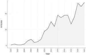 The distribution of studies by year shows years in which the subject was popular, and trends may include multiple papers in subsequent years. Until 2004, the number of publications was a maximum of two, and after that year the number of publications increased. The maximum number of publications up to 2009 was eight per year. Since 2010, the number of publications increased to double digits, rising continuously from 2008 to 2012, documenting increasing awareness about post-earthquake disasters. After 2010, there was a fluctuating trend in the number of publications, but an overall increase, from 18 in 2010 to 53 in 2020. The number of publications was 27 in 2018, 36 in 2019, and 49 in 2021 (Fig. 2). The annual growth rate was 19.88%. In 2022, a record was broken with 54 academic publications.