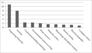 Of the 521 academic publications researched, 421 were articles, 85 proceeding papers, 8 review articles, and 7 book chapters. The research areas with the most academic studies (Fig. 3) were engineering with 273 academic publications (10.9%), geology with 200 (8%), construction-building technology with 61 (2.4%), environmental science-ecology with 59 (2.3%), water resources with 52 (2%), materials science with 40 (1.6%), meteorology-atmospheric sciences with 38 (1.5%), remote sensing with 35 (1.4%), physical geography with 32 (1.2%), and computer sciences with 23 (0.9%).