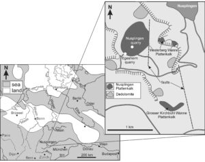 Figure 1. Map showing the location and distribution of the Nusplingen Plattenkalk in the southwestern part of the Swabian Alb (modified from Klug et al. 2010a).