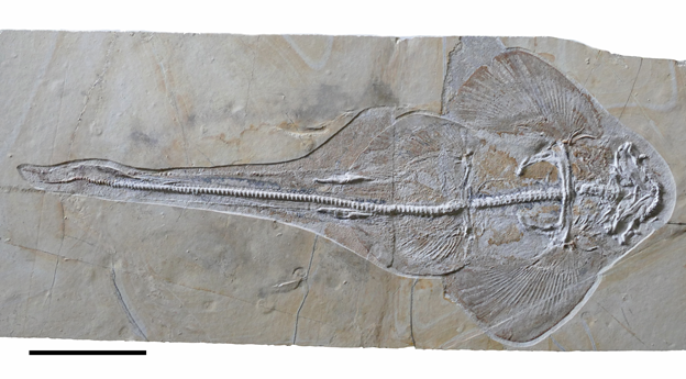 Figure 3. A male angel shark Pseudorhina acanthoderma (SMNS 96393/9) from the Nusplingen quarry found in 2013. Scale bar = 200 mm. Photo. G. Schweigert.