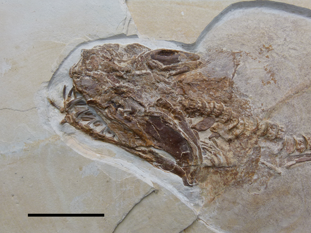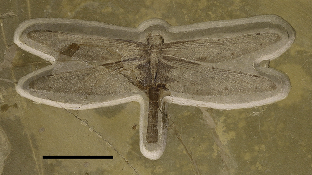 Figure 5. Holotype of the dragonfly Urogomphus nusplingensis (SMNS 62602) from bituminous beds of the Nusplingen quarry. Scale bar = 50 mm. Photo: G. Schweigert.