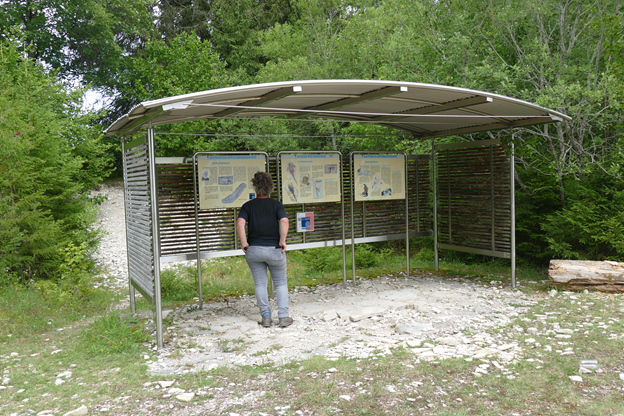 Figure 6. The “main station” of the geological trail, located at the southern entrance to the Nusplingen quarry, provides information in Germany and English language. Photo: G. Schweigert.