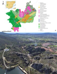 Figure 2. A) The geological map of Naturtejo UNESCO Global Geopark with the location of Penha Garcia Ichnological Park. B) Aerial view of the Park located in the 140 m-deep Ponsul river gorge just at the backskirts of Penha Garcia.