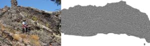 Figure 3. A) Cruziana burrows are among the most abundant trace fossils in Penha Garcia Ichnological Park, covering large bedding planes with their scribbling foraging patterns, and attracting the curiosity of the visitors (A). B) 3D model of part of the exposed bedding surface showing a dense trilobite foraging area with the typical bilobate burrow patterns, with a visible part of the bed below apparently unbioturbated.