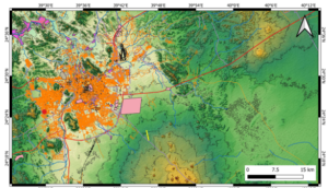 Figure 1. Outline of the greater Al Madinah region just north of the Harrat Rahat Volcanic Field on a DEM with 50 m contour lines. Red dot is the Al-Du’aythah volcanic cones region. Yellow line is the 1256 CE historic eruption site fissure. Pink zones are the major construction site, while light purple marks the orchards including palm farms. Orange and dark green refer to the built environment of the city.