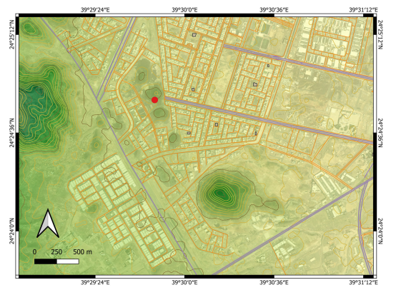 Figure 3. Vicinity of the Al-Du’aythah volcanic cones. Red dot marks the studied cone.