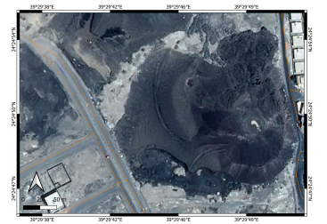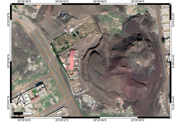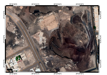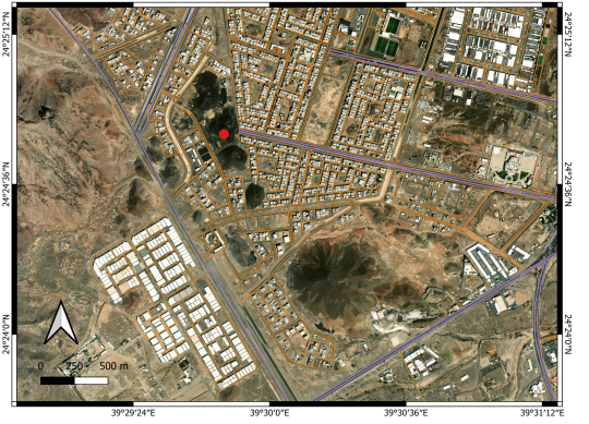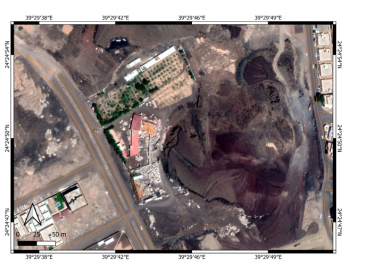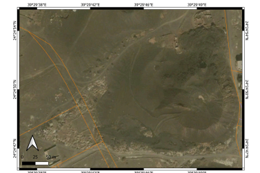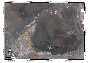We conducted site visits in 2023 to check visually the status of the location. This visit was part of a field campaign of the Saudi Geological Survey to collect direct field observation data to better characterize the potential eruption scenarios in the greater Al Madinah region. During this field visit, direct photo documentation of the status of the sites was completed. As the last detailed study dates to 2012-13, a complete satellite imagery study was performed by applying Google Earth Pro satellite imagery through the available historic data sets. The data sets go back to 2004, providing an excellent array of spatial information to trace landform changes over a nearly 20-year period (2004–2023). This is valuable information, as ten years ago such diverse image data sets were not accessible, and the resolution of the available images was unsuitable for the detail of observations needed. In addition, a basic survey was conducted through available Sentinel satellite imagery. This data set has a useful image library since 2017, hence only the last six years of land use changes can be determined. The highest resolution of these images is 9 m, so they cannot be used to identify great detail of the cones, but they are sufficient to see the context of the location of these cones within the basin of Al Madinah. We used three types of satellite images: moisture index map (sensitive for water-rich substances or surfaces); short wavelength infrared imagery (SWIR; sensitive to vegetation and water availability in the near surface regions); and false color (urban) images normally used to locate vegetation and urbanization. For spatial information, ALOS -PALSAR Terrain Corrected digital elevation models were obtained that provided 12.5 m resolution elevation data. This data was not useful directly to trace the small volcanic cone morphological changes.  It was instead used to characterize the morphology of the greater Al Madinah Basin. On these elevation maps, key man-made features such as highways, buildings, mosques, and orchards were also shown, extracted from spatial data available from the Open Street Map services. Direct field observations were also accompanied by basic macroscopic documentation of the exposed volcanic lithologies.