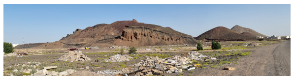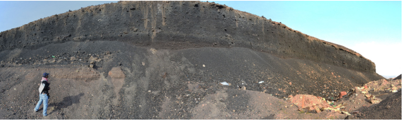 Figure 5. Panoramic view in 2023 of the western section of the central north cone with exposed thick phreatomagmatic tephra overlain by dark scoriaceous ash and lapilli. The image faces towards the east (direction of the center of Al Madinah City).