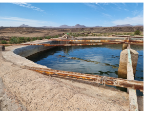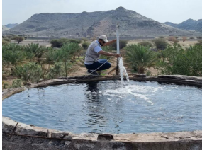 Figure 7. Ground water from a well at the southeaster edge of the Harrat Rahat Volcanic Field. Note the trachytic lava domes in the background.