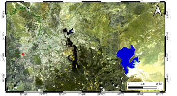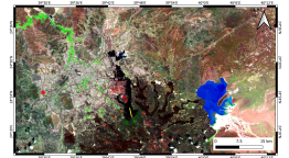 Figure 8. Sentinel SWIR Satellite Image of the greater Al Madinah region. Note the young lava flows, the green regions where vegetation flourish, and the large temporal lake marked by dark blue. The image was taken on 27 March 2023.
