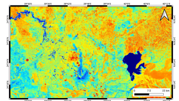 Figure 10. Sentinel Moisture Index map showing moist (water availability) zones in blue while dry regions are dark orange or red. The image was taken on 27 March 2023.