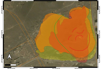 After finding new exposures during the 2023 field campaign, we explored land degradation of the Al-Du’aythah volcanic cones. Following the available satellite data sets of the Google Earth Pro service, we selected the best possible images by visual inspection. Each image was georeferenced and incorporated in a GIS database within Q-GIS for comparison of the geometrical changes (e.g., surface area and cliff positions) between 2004 and 2023. We intended to select images that were taken in wintertime where the contrast is high due to moisture content. The earliest available image date back to November 2004 when the cone shows clear and intact morphological elements (Fig. 11). The eastern edge and limit of the cone still show nearly the original extent and mark a steep eastern slope with some original erosional ravines.